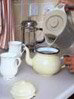 Before tealeaves are placed within a pot, pour hot water over the pot and cups so until they are warmed. Alternatively, fill teapot with hot water then pour more hot water into teacups to warm.